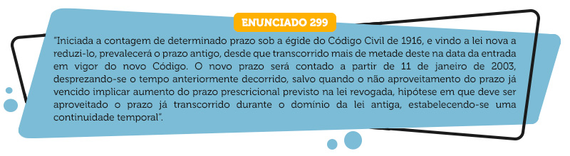 As próprias regras de transição entre o Código Civil de 1916 e o atual foram objeto de enunciados nas jornadas. Na quarta edição, foi aprovado o Enunciado 299, que trata da contagem do prazo de prescrição.