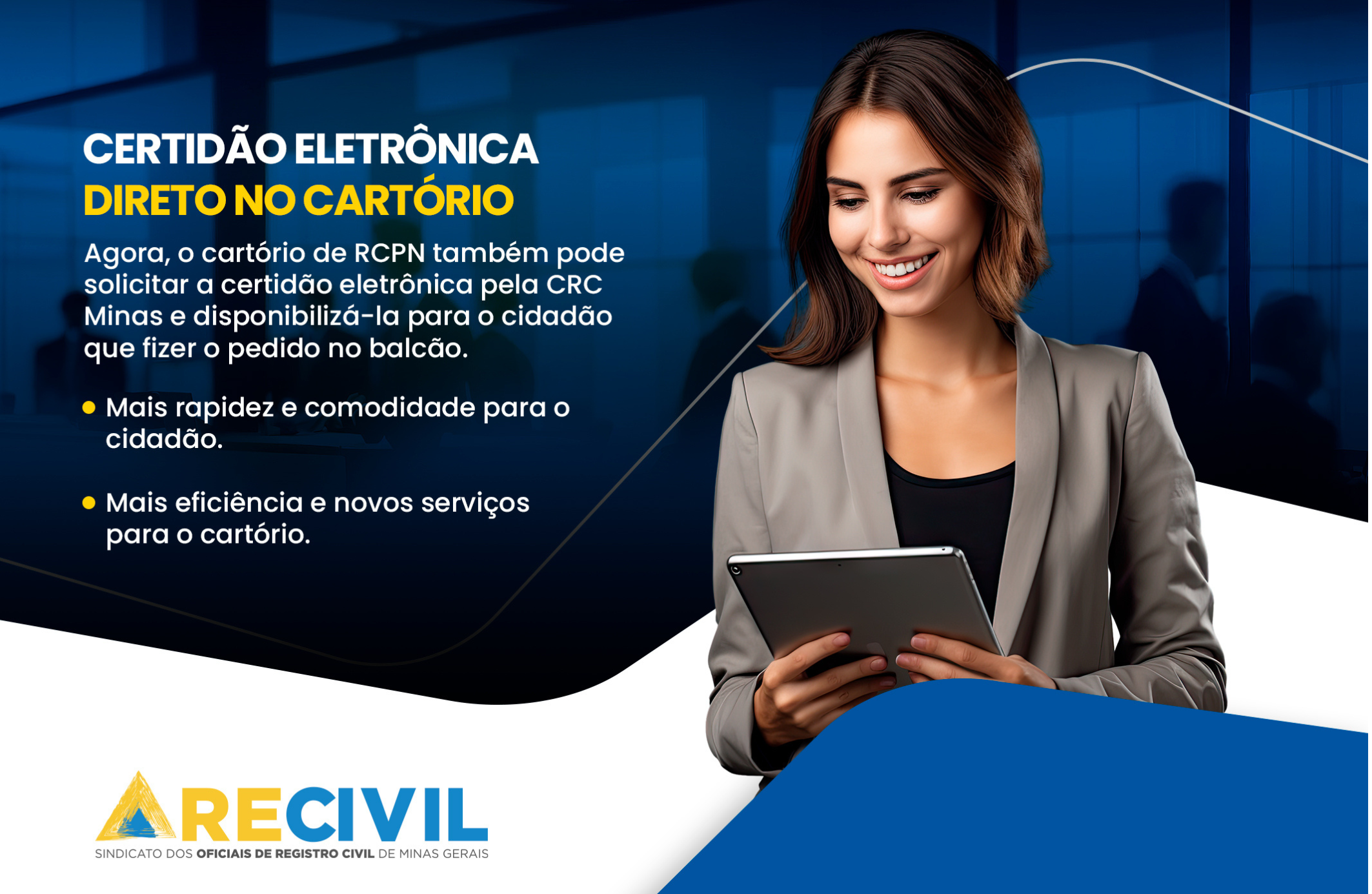 Agora, o cartório de RCPN também pode solicitar a certidão eletrônica pelo CRC Minas e disponibilizá-la ao cidadão que fizer o pedido no balcão. Mais rapidez e comodidade para o cidadão, mais eficiência e novos serviços para o cartório.