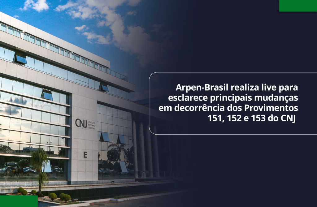 Nesta quinta-feira (05), às 19h, a Arpen-Brasil promove uma live para explorar as recentes atualizações trazidas pelos Provimentos 151, 152 e 153, do Conselho Nacional de Justiça. O evento on-line contará com a participação da juíza auxiliar da Corregedoria Nacional de Justiça, Carolina Ranzolin Nerbass.