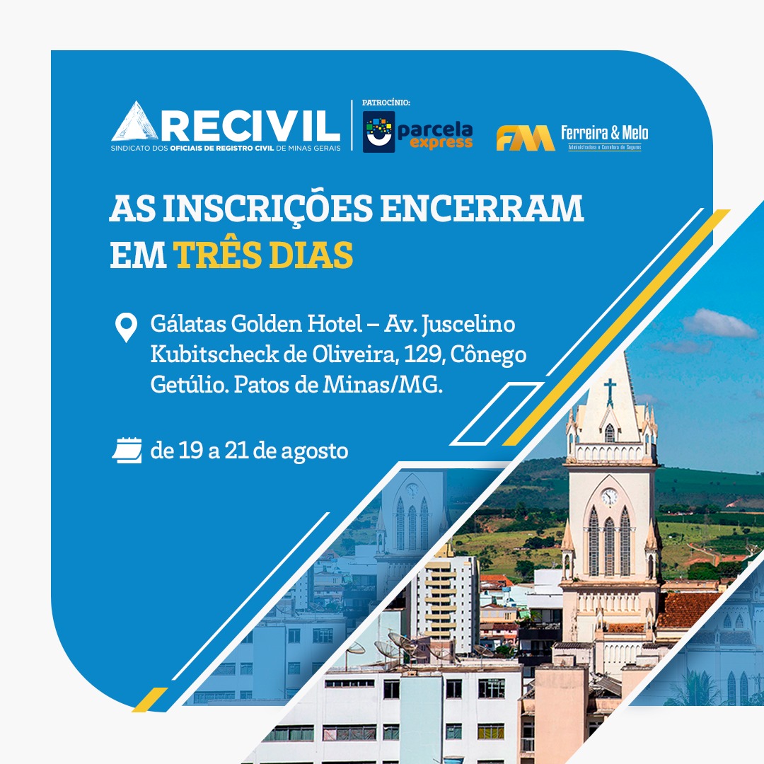 Estão encerrando as inscrições para o Curso de Qualificação do Recivil que acontece na cidade de Patos de Minas, nos dias 19, 20 e 21 de agosto. As inscrições podem ser feitas até 19 de agosto ou até enquanto durarem as vagas.