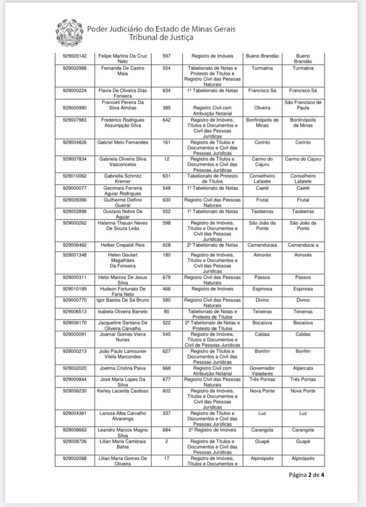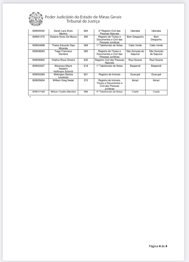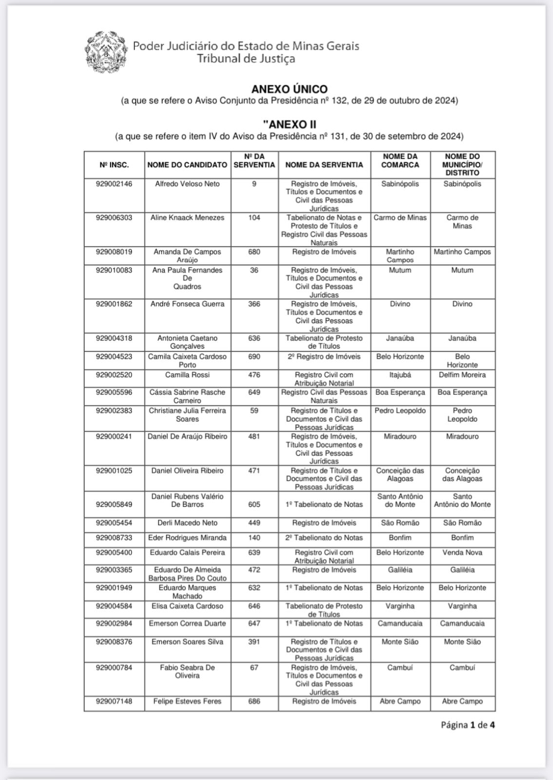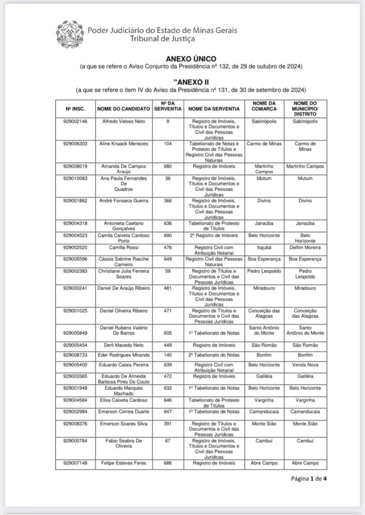 CONSIDERANDO o Aviso Conjunto da Presidência nº 131, de 30 de setembro de 2024, que “Avisa sobre a solenidade coletiva de outorga de delegação e investidura dos novos delegatários dos serviços notariais e de registro, aprovados no Concurso Público, de Provas e Títulos, para Outorga de Delegações de Notas e de Registro do Estado de Minas Gerais regido pelo Edital nº 1/2019, a ser realizada no dia 1º de novembro de 2024”;