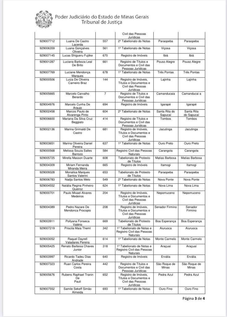 CONSIDERANDO a Decisão PRESIDÊNCIA nº 25132/2024 proferida no processo SEI nº 0185472-03.2024.8.13.0000, em 20 de setembro de 2024, por meio da qual foi deferido o pedido de reconsideração do resultado da publicação das Escolhas da Sessão de de 13 de setembro de 2024, para que o Tabelionato de Protesto de Títulos da Comarca de Matias Barbosa seja incluído na relação da escolha dos serviços pela candidata Mirella Masson Duarte;