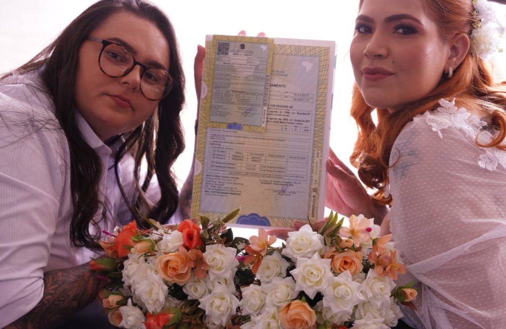 Contar com a segurança do “papel passado” para oficializar a união levou um casal de mulheres a tomar a decisão mais importante em pouco mais de dois anos de vida em comum: casar em cartório. “Nossa história vale mais que tudo, mas para a sociedade ainda conta o registro”, justifica a noiva Daniela Veras, 27 anos, minutos antes de dizer sim para a companheira Rayane Peixoto de Castro, 31 anos.