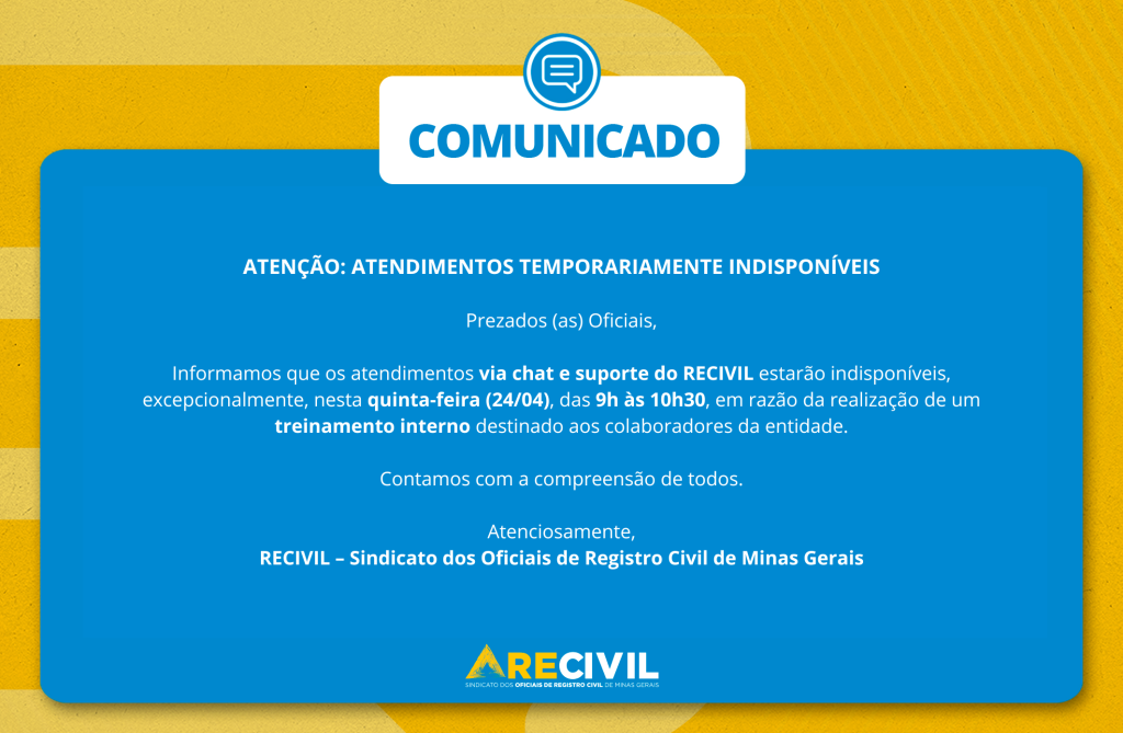 Informamos que os atendimentos via chat e suporte do RECIVIL estarão indisponíveis, excepcionalmente, nesta quinta-feira (24/04), das 9h às 10h30, em razão da realização de um treinamento interno destinado aos colaboradores da entidade.