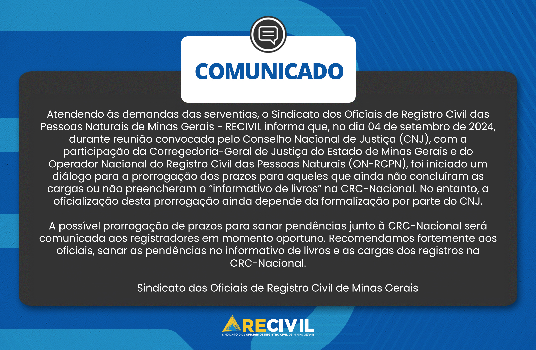 Atendendo às demandas das serventias, o Sindicato dos Oficiais de Registro Civil das Pessoas Naturais de Minas Gerais – RECIVIL informa que, no dia 04 de setembro de 2024, durante reunião convocada pelo Conselho Nacional de Justiça (CNJ), com a participação da Corregedoria-Geral de Justiça do Estado de Minas Gerais e do Operador Nacional do Registro Civil das Pessoas Naturais (ON-RCPN), foi iniciado um diálogo para a prorrogação dos prazos para aqueles que ainda não concluíram as cargas ou não preencheram o “informativo de livros” na CRC-Nacional. No entanto, a oficialização desta prorrogação ainda depende da formalização por parte do CNJ.