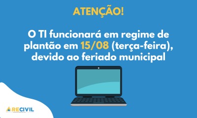 Comunicamos que, devido ao feriado municipal de Nossa Senhora da Boa Viagem, em Belo Horizonte, no dia 15 de agosto, o TI funcionará com a equipe reduzida.