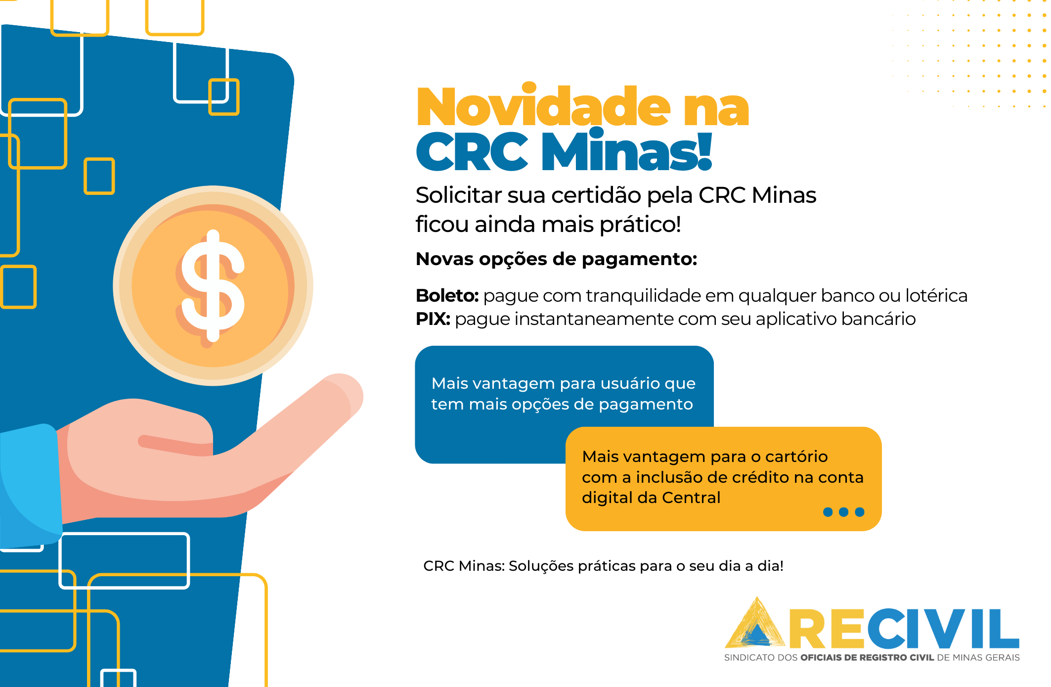A partir de agora, solicitar segunda via de certidão de nascimento, casamento ou óbito pela CRC Minas ficou ainda mais fácil. A plataforma acaba de lançar a opção de pagamento via Pix. Essa novidade garantirá maior agilidade nos processos de emissão das certidões e no recebimento dos emolumentos pelas serventias.