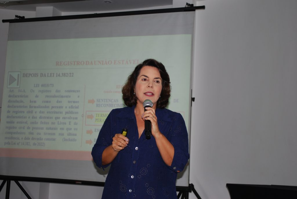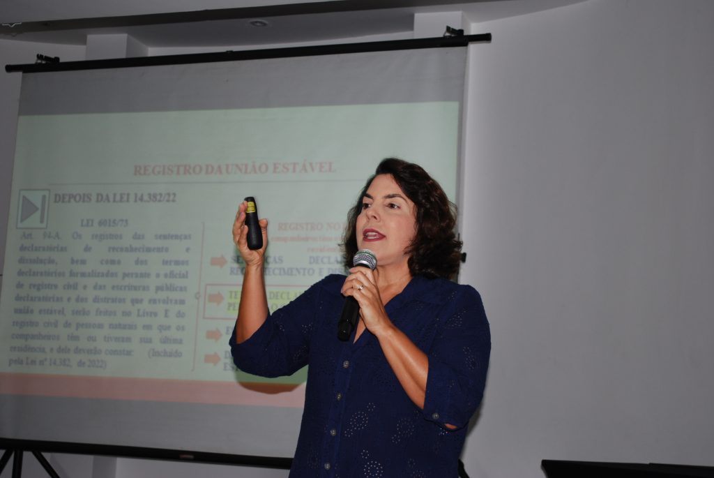 No painel, a diretora falou sobre regime de bens, adoção de sobrenome, rerratificação de escritura pública e registros no livro E. “Para definir o regime de comunhão universal em casais acima dos 70 é necessário ter prova documental como endereço de residência, filhos em comum, promessas de compra e venda e contratos ou escrituras no nome do casal”, alertou.