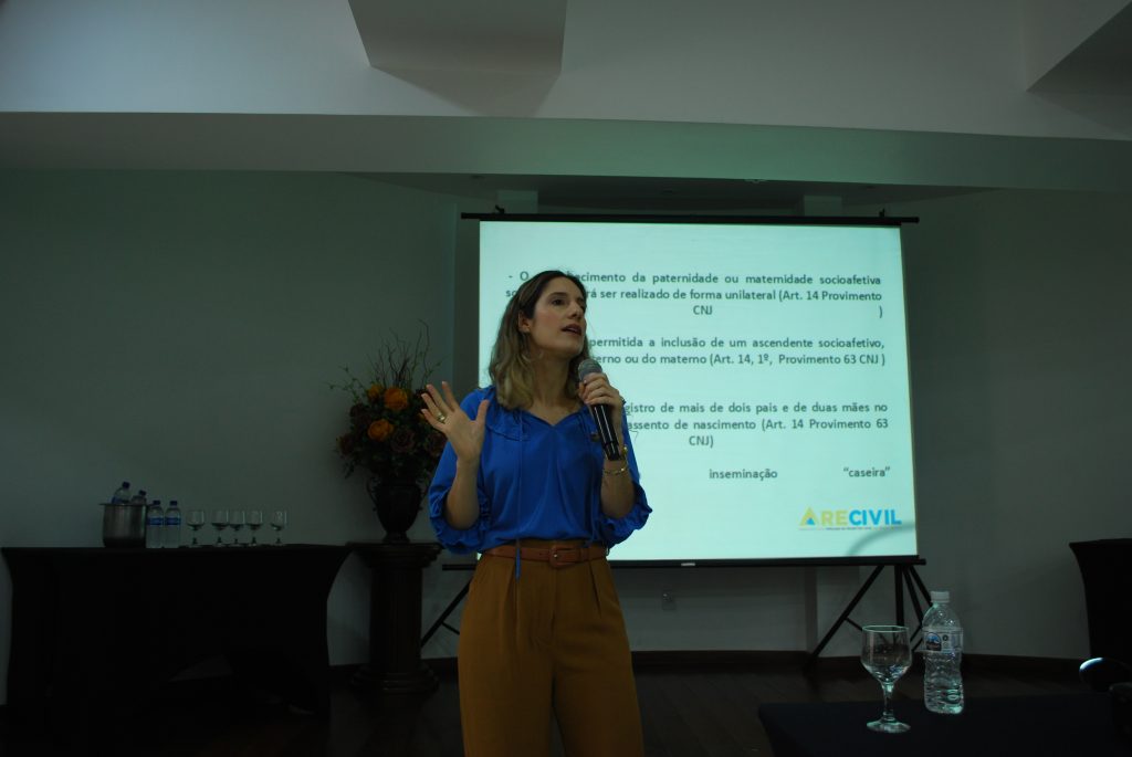 A advogada do Recivil, Flávia Mendes, palestrou o tema “Pontos Relevantes sobre Registro de Nascimento”. O prazo para registrar uma criança, naturalização, parentalidade em casais homossexuais e unidade interligada estavam entre os tópicos abordados.