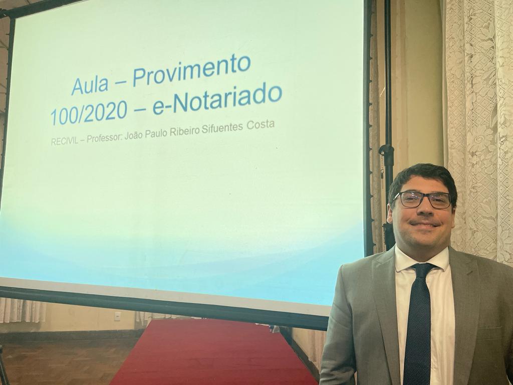 Ainda no primeiro dia de curso, João Paulo Sifuentes, oficial em Tiradentes falou sobre o provimento 100/CNJ e o e-Notariado. Entre os assuntos abordados, estava o reconhecimento de firma em meio eletrônico. “Compete exclusivamente ao tabelião de notas reconhecer assinaturas eletrônicas em documentos digitais”, explicou Sifuentes.
