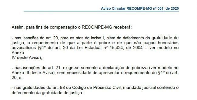 O Aviso Circular nº 001, de 2020, publicado no dia 17 de outubro de 2020, determina os documentos exigidos para a compensação dos atos gratuitos ou isentos de emolumentos praticados pelos notários e registradores mineiros. Ele revogou todos os demais Avisos anteriores, garantindo ao registrador e ao notário instruções adequadas e seguras, para fins da devida e justa compensação dos atos gratuitos ou isentos praticados.