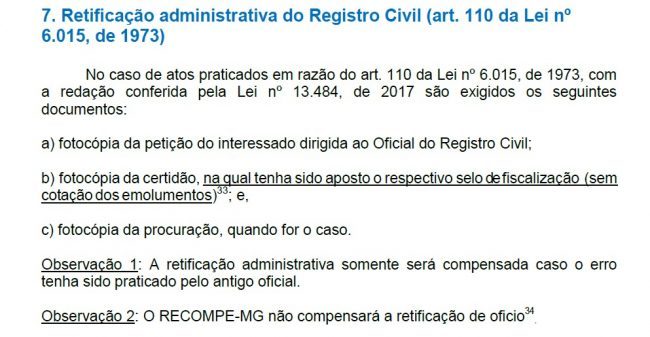 Já para a retificação administrativa do Registro Civil, prevista no art. 110 da Lei nº 6.015, de 1973, são exigidos somente os seguintes documentos: fotocópia da petição do interessado dirigida ao Oficial do Registro Civil; fotocópia da certidão, na qual tenha sido aposto o respectivo selo de fiscalização (sem cotação dos emolumentos) e fotocópia da procuração, quando for o caso.