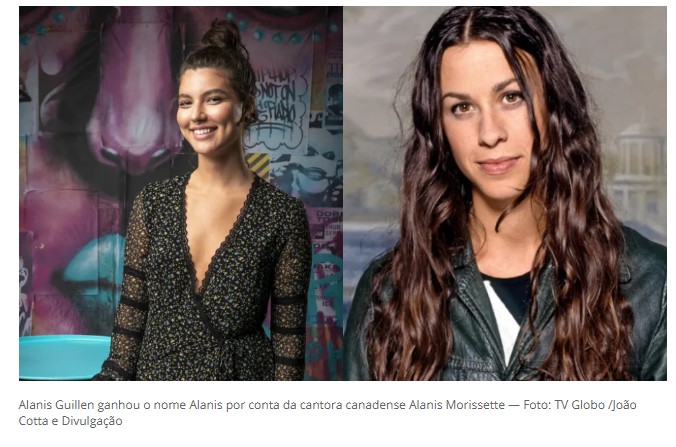 A atriz Alanis Gullen, famosa por interpretar Juma na última versão da novela “Pantanal”, também teve o nome inspirado no universo do rock. Seu nome é uma homenagem direta à talentosa cantora e compositora canadense Alanis Morissette, cujas músicas e letras intensas tiveram um impacto significativo em sua vida. Ela afirma em uma entrevista que um tio presenteou seus pais com o CD ‘Jagged Little Pill’, quando sua mãe estava grávida, e que logo que eles bateram o olho na capa do CD tomaram a decisão em homenagear a roqueira. (link da entrevista)