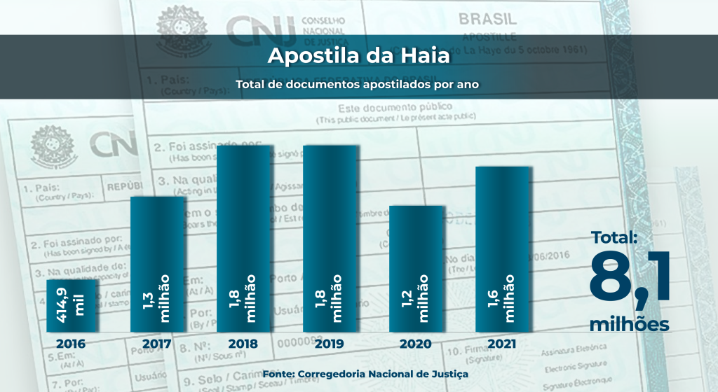 Em 2021, o país registrou um aumento de 35% no total de documentos apostilados pelos cartórios brasileiros, chegando a quase 1,64 milhão. Com o resultado, o número total de documentos apostilados desde agosto de 2016, quando a Resolução n. 228 do Conselho Nacional de Justiça (CNJ) estabeleceu responsáveis pelos cartórios extrajudiciais como autoridades competentes para emitir a Apostila no Brasil, ultrapassou a marca dos oito milhões.