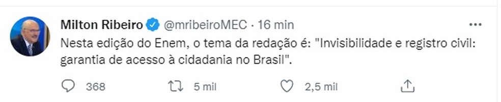 O tema da redação do Enem 2021 foi “invisibilidade e registro civil: garantia de acesso à cidadania no Brasil”.A informação foi divulgada no Twitter do ministro da Educação, Milton Ribeiro. A redação faz parte do primeiro dia de prova, realizada neste domingo (21).