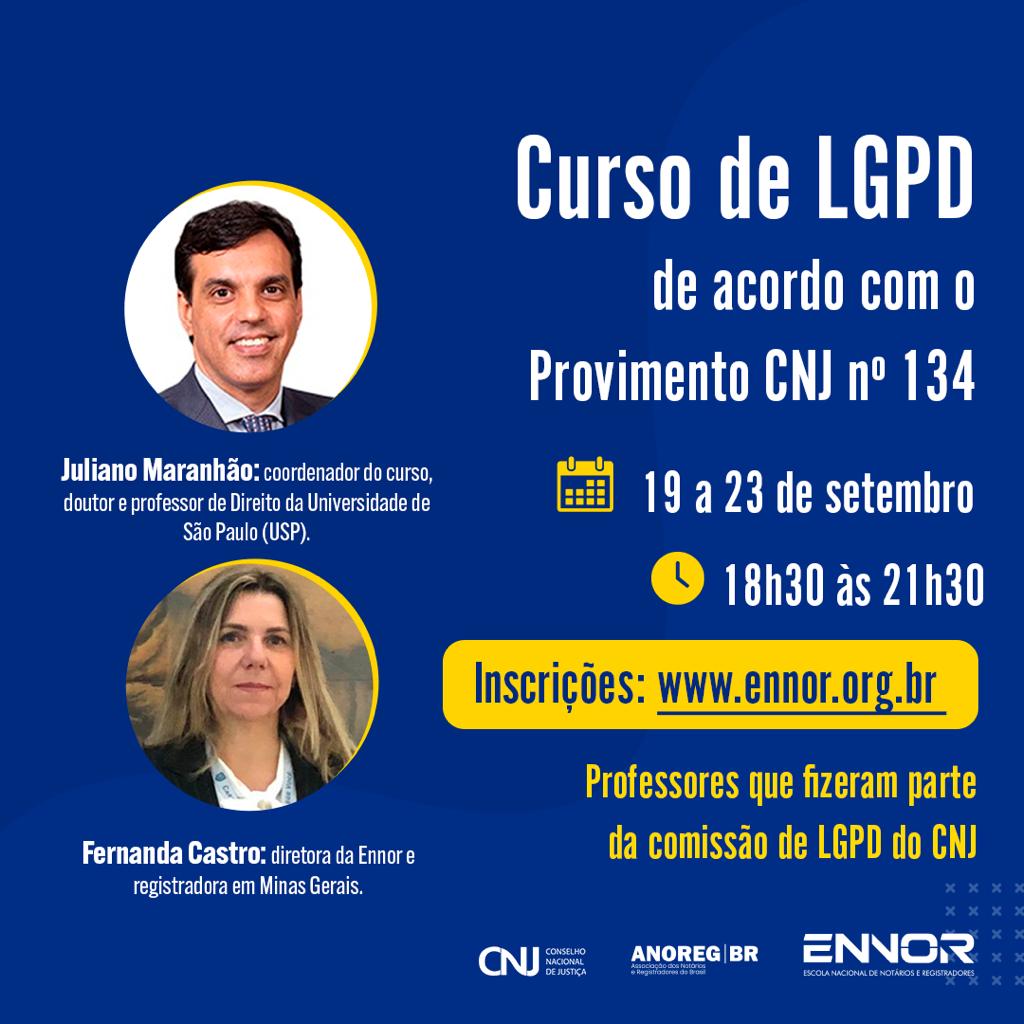 Nesta segunda-feira (19) terá inicio o curso sobre LGPD oferecido pela ENNOR que tem como objetivo instruir notários e registradores sobre a adequação dos cartórios à Lei Geral de Proteção de Dados (LGPD) e ao Provimento nº 134 do Conselho Nacional de Justiça (CNJ). Mais informações acesse: www.ennor.org.br.