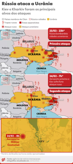 A Rússia, com autorização do presidente, Vladimir Putin, iniciou na madrugada desta quinta-feira (24) uma ampla operação militar para invadir a Ucrânia. Há imagens de explosões e movimentações de tanques em diferentes cidades ucranianas. Putin disse às forças ucranianas que deponham as armas e voltem para casa.