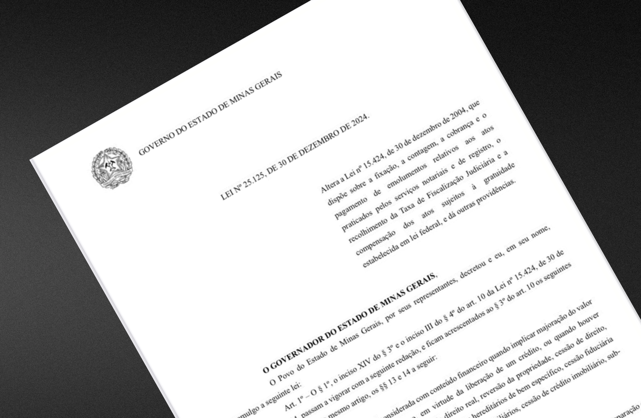 O Governo do Estado de Minas Gerais sanciona Lei nº 25.125, que altera a Lei nº 15.424, de 30 de dezembro de 2004, sobre a fixação, a contagem, a cobrança e o pagamento de emolumentos relativos aos atos praticados pelos serviços notariais e de registro, o recolhimento da Taxa de Fiscalização Judiciária e a compensação dos atos sujeitos à gratuidade estabelecida em lei federal, e dá outras providências.