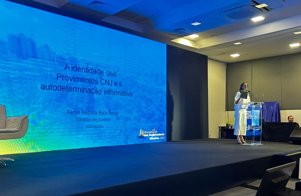 Para fechar a maratona de conteúdos do evento, Karin Rosa falou sobre a autodeterminação informativa e o direito do cidadão de ter controle sobre seus dados e informações pessoais. “Esses dados, primeiro passam por um Cartório de Registro Civil”.
