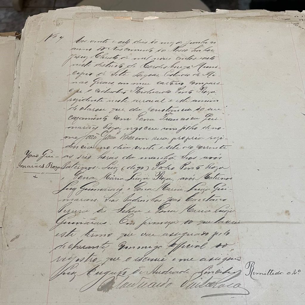 A guardiã do tesouro é a oficiala Denise Machado, responsável pelo cartório na cidade natal de Guimarães. “No acervo temos o livro em que ele foi registrado e a gente guarda com muito carinho e cuidado, porque é bem antigo. A gente pode brincar que ele é o xodozinho do cartório”, conta. O registro, feito à mão, está na página nº 7 do livro 1A. No documento constam o nome completo do escritor, João Guimarães Rosa, e de seus pais Florduardo Pinto Rosa e Francisca Guimarães Rosa.