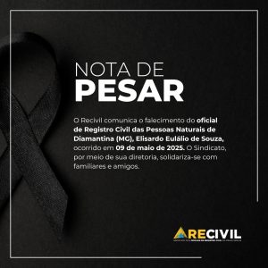 O Recivil comunica o falecimento do oficial de Registro Civil das Pessoas Naturais de Diamantina (MG), Elisardo Eulálio de Souza, ocorrido em 09 de maio de 2025.