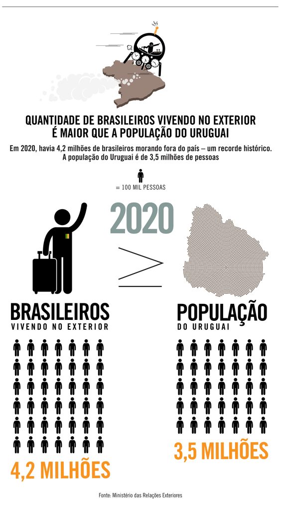 Em 2020, havia 4,2 milhões de brasileiros vivendo no exterior. É uma quantidade maior do que toda a população do Uruguai, que tem 3,5 milhões de habitantes.