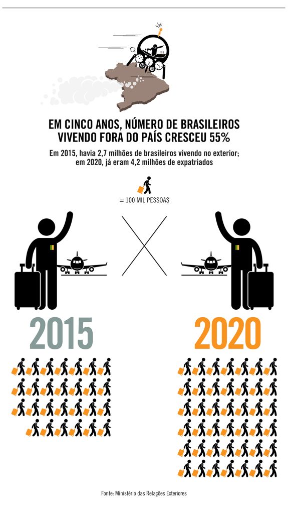 A quantidade de brasileiros vivendo no exterior cresceu continuamente desde 2015, tendo atingido um recorde histórico em 2020. Sete anos atrás, havia 2,7 milhões de brasileiros expatriados. Em 2020, esse número já tinha saltado para 4,2 milhões.