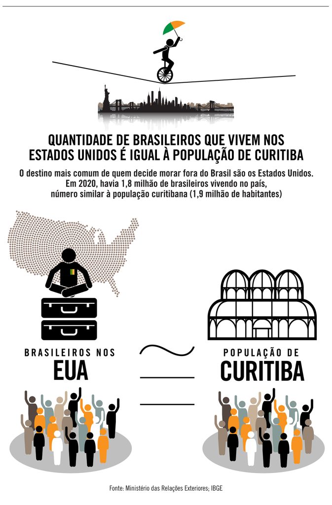 O principal destino dos brasileiros que decidem morar fora são os Estados Unidos (42% dos casos). Em 2020, havia 1,8 milhão de brasileiros vivendo no país, número que equivale à população de Curitiba (PR), que atualmente tem 1,9 milhão de habitantes.