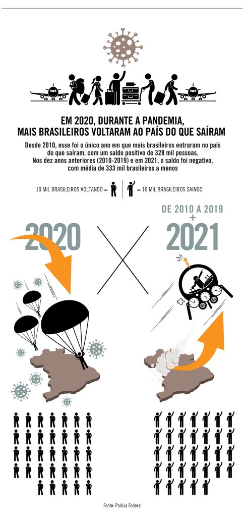 Em 2020, pela primeira vez na década, o Brasil registrou um saldo positivo de entrada de brasileiros no país. Isto é: mais brasileiros chegaram do que saíram do Brasil. Nos dez anos anteriores (2010 a 2019), assim como em 2021, o saldo foi negativo. Em média, nesses anos, o Brasil “perdeu“ 333 mil brasileiros.