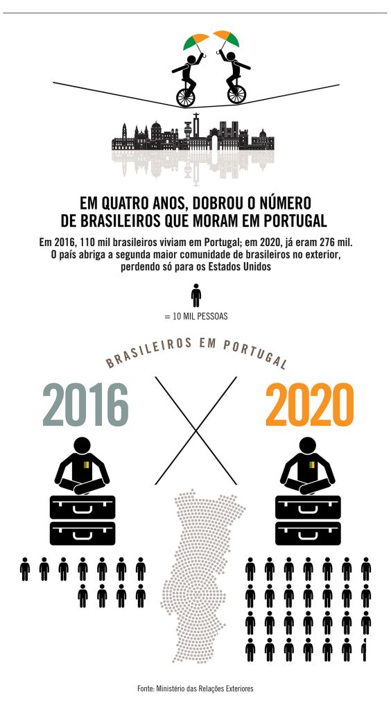 Depois dos Estados Unidos, o país que mais atrai brasileiros, com 6,5% do total de emigrantes, é Portugal. Em 2016, havia 110 mil brasileiros morando em Portugal. Em 2018, eram 111 mil, e, em 2020, o número saltou para 276 mil.