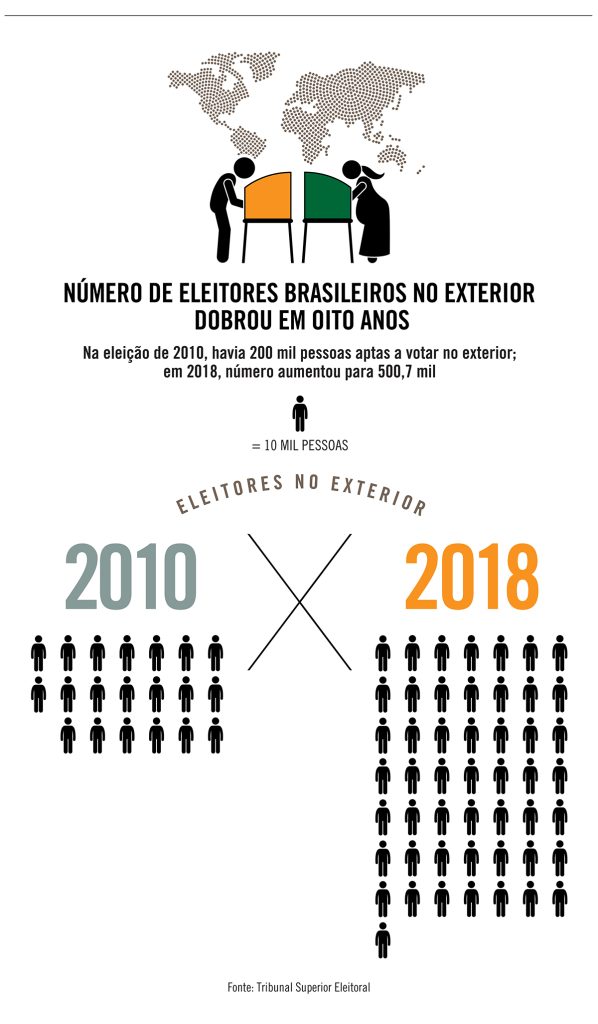Os brasileiros que moram no exterior são obrigados a votar somente a cada quatro anos, na eleição presidencial. Desde 2010, refletindo a emigração crescente de brasileiros, o número de pessoas aptas a votar fora do Brasil aumentou ano a ano. Em 2010, havia 200 mil eleitores registrados no exterior. Em 2014, 354 mil. Em 2018, o número chegou a 500,7 mil.