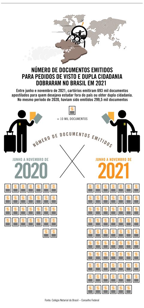 O apostilamento, recurso que permite o reconhecimento de documentos brasileiros em outros países, aumentou bastante no segundo semestre de 2021. Entre junho e novembro, os cartórios emitiram 693 mil documentos apostilados para quem desejava estudar fora ou tirar dupla cidadania. No mesmo período de 2020, haviam sido emitidos 299,5 mil documentos – ou seja, o número dobrou de um ano para o outro. Os apostilamentos para pedidos de visto e dupla cidadania representavam 55% do total de documentos requisitados nos cartórios em 2020. Em 2021, essa proporção passou a ser de 76%.