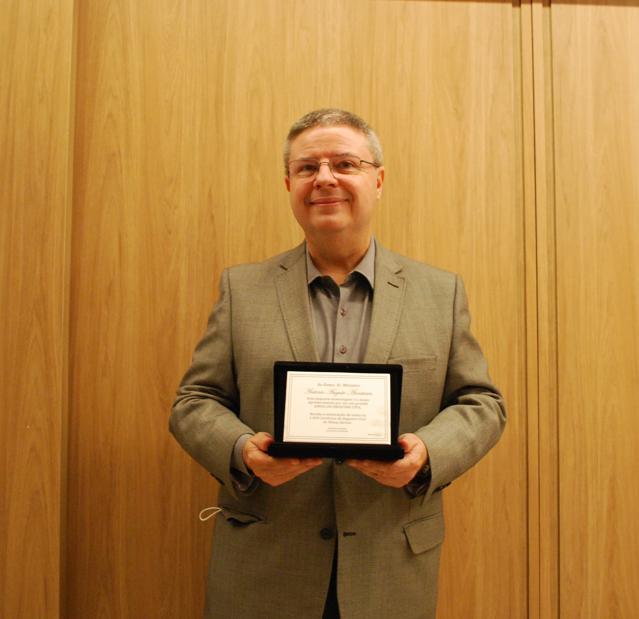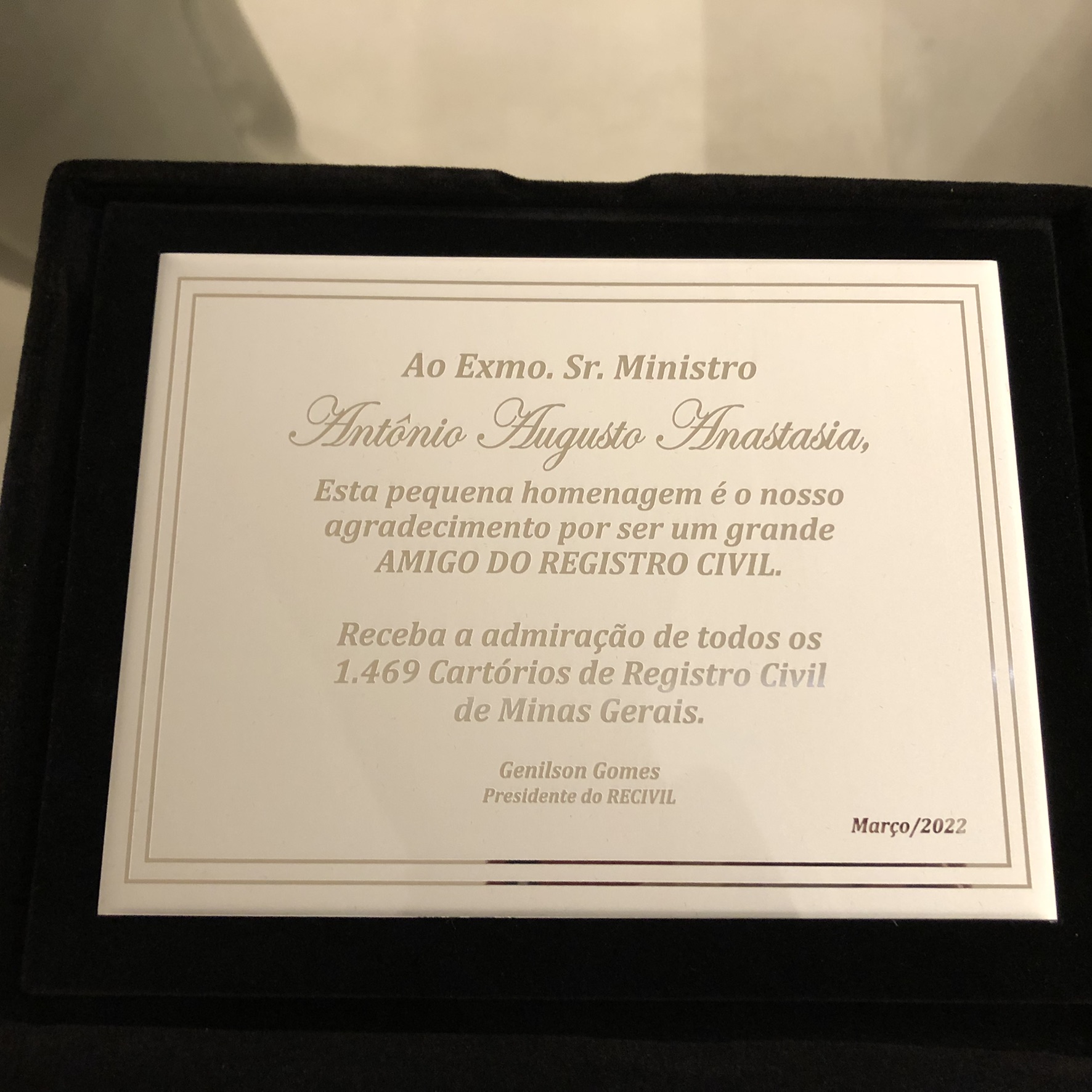 Na oportunidade, o Recivil presenteou o ministro com uma placa de homenagem “Amigo do Registro Civil”, pelo apoio à classe cartorária, representando os 1.469 cartórios de Registro Civil de Minas Gerais.