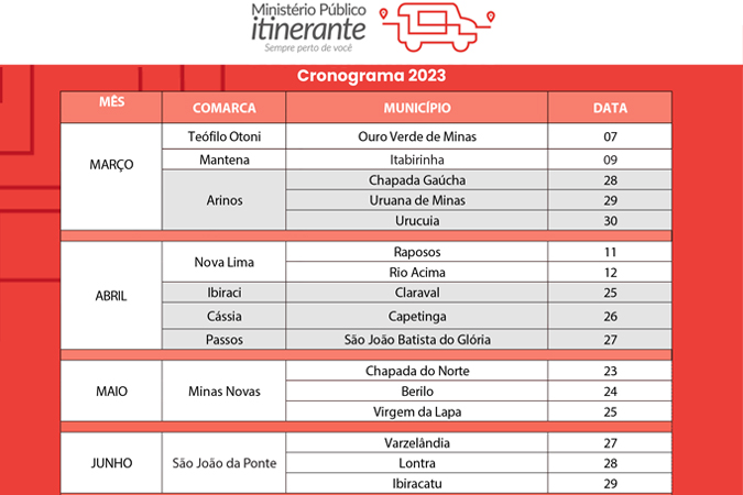 Em abril, o projeto atenderá os municípios de Raposos e Rio Acima (comarca de Nova Lima), nos dias 11 e 12. Entre os dias 25 e 27 de abril os atendimentos serão nos municípios de Claraval (comarca de Ibiraci), Capetinga (comarca de Cássia) e São João Batista do Glória (comarca de Passos).