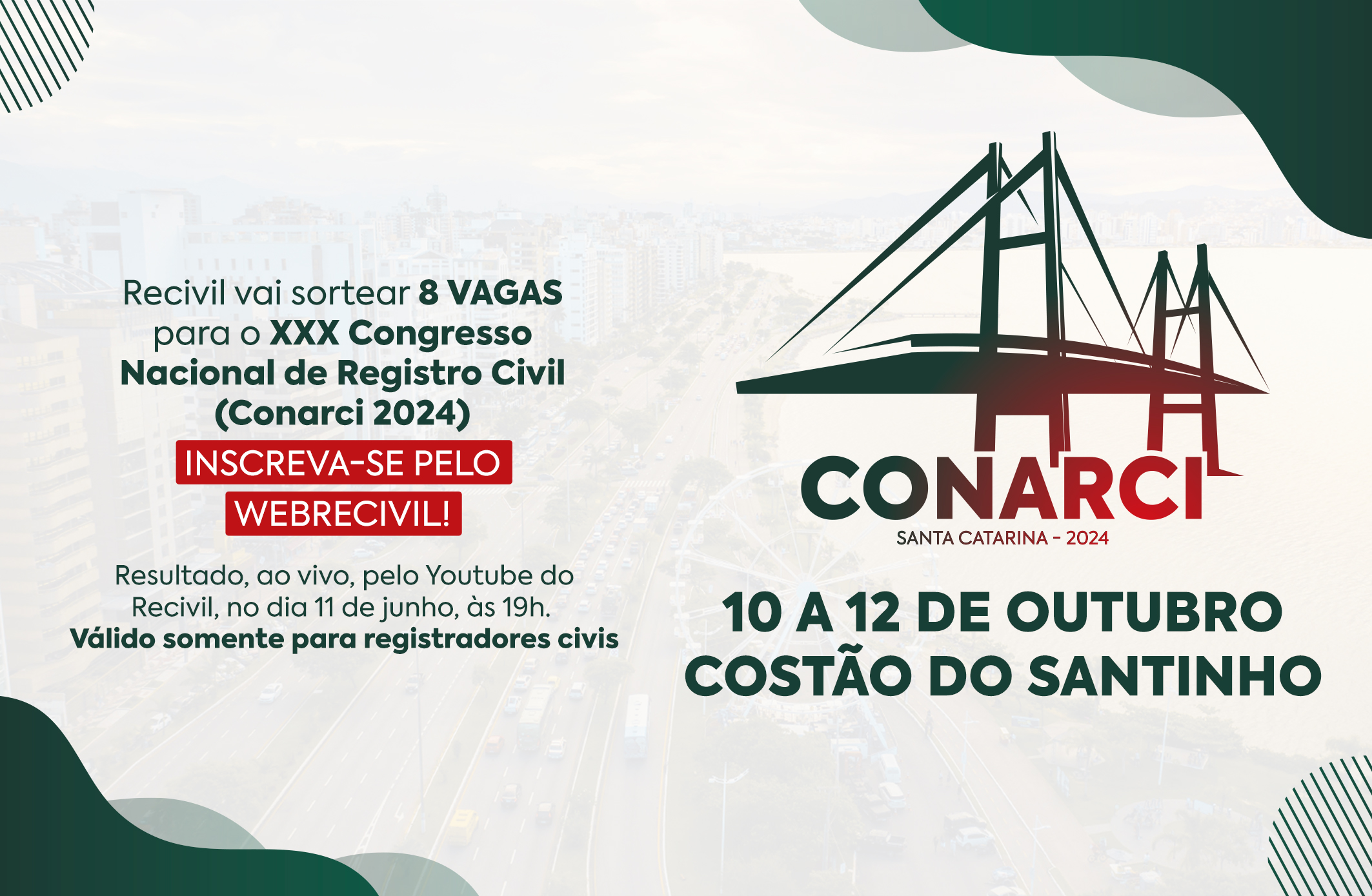 Uma boa notícia para os oficiais de Registro Civil das Pessoas Naturais de Minas Gerais! Esse ano, oito registradores serão os convidados do Recivil para o XXX Congresso Nacional de Registro Civil (Conarci 2024), que será realizado no Costão do Santinho Resort, em Santa Catarina, de 10 a 12 de outubro, com direito a inscrição no evento, passagem e hospedagem gratuitos*.