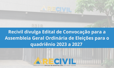 O Sindicato dos Oficiais de Registro Civil das Pessoas Naturais do Estado de Minas Gerais (RECIVIL) publica o Edital de Convocação para a Assembleia Geral Ordinária de Eleições para o quadriênio 2023 a 2027 conforme Estatuto Social. O prazo para registro das chapas tem início nesta quarta-feira, 03/05, às 09h e encerra-se no dia 11/05 (quinta-feira), às 17h, horário de funcionamento da secretaria da entidade. A eleição está marcada para dia 27/05, sábado, das 09h30min às 17h, na sede da instituição, rua dos Timbiras, nº 2318, bairro: Lourdes, Belo Horizonte/ MG.