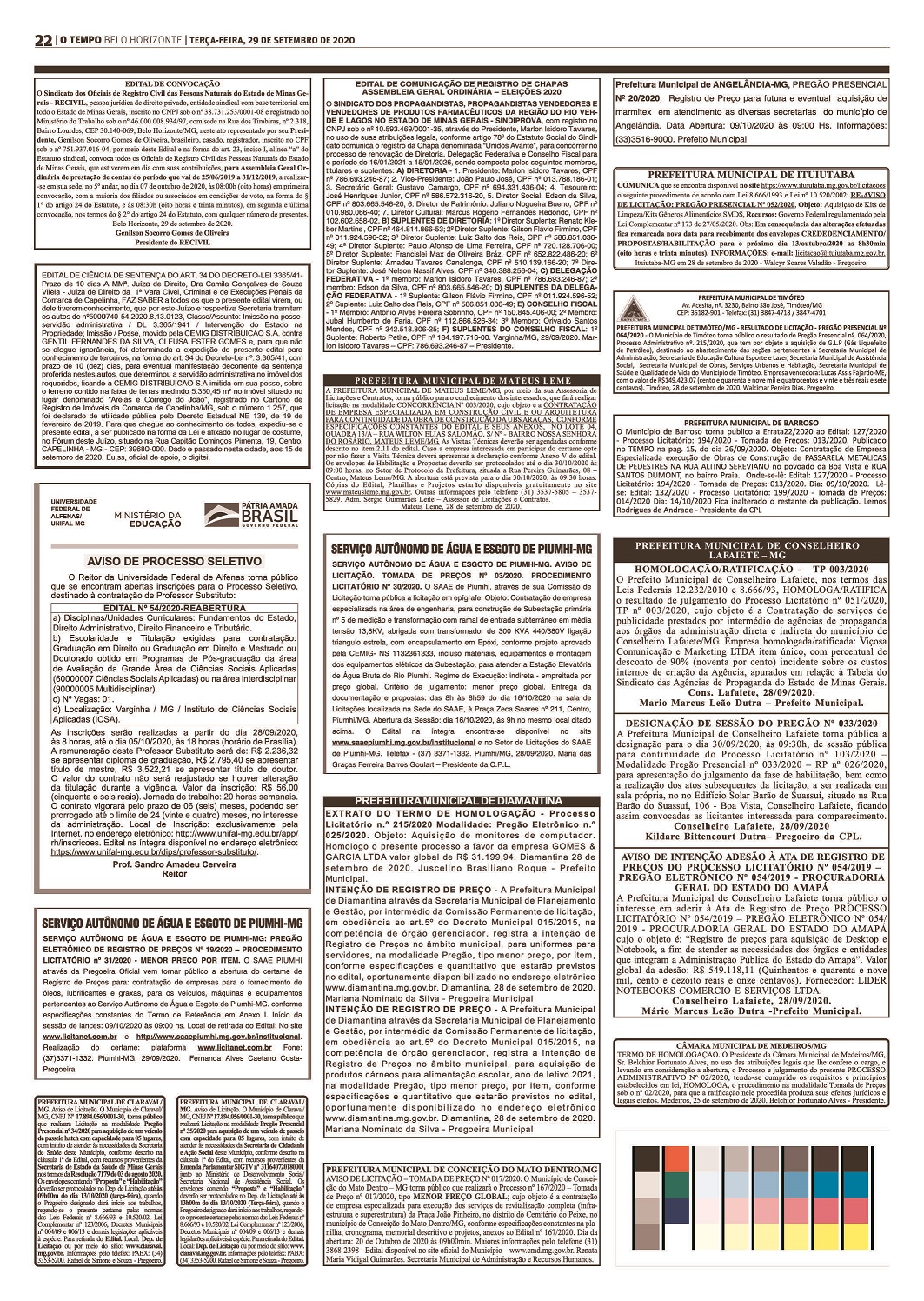 O Sindicato dos Oficiais de Registro Civil das Pessoas Naturais do Estado de Minas Gerais – RECIVIL, pessoa jurídica de direito privado, entidade sindical com base territorial em todo o Estado de Minas Gerais, inscrito no CNPJ sob o nº 38.731.253/0001-08 e registrado no Ministério do Trabalho sob o nº 46.000.008.934/97, com sede na Rua dos Timbiras, nº 2.318, Bairro Lourdes, CEP 30.140-069, Belo Horizonte/MG, neste ato representado por seu Presidente, Genilson Socorro Gomes de Oliveira, brasileiro, casado, registrador, inscrito no CPF sob o nº 751.937.016-04, por meio deste Edital e na forma do art. 23, inciso I, alínea “a” do Estatuto sindical, convoca todos os Oficiais de Registro Civil das Pessoas Naturais do Estado de Minas Gerais, que estiverem em dia com suas contribuições, para Assembleia Geral Ordinária de prestação de contas do período que vai de 25/06/2019 a 31/12/2019, a realizar-se em sua sede, no 5º andar, no dia 07 de outubro de 2020, às 08:00h (oito horas) em primeira convocação, com a maioria dos filiados ou associados em condições de voto, na forma do § 1° do artigo 24 do Estatuto, e às 08:30h (oito horas e trinta minutos), em segunda e última convocação, nos termos do § 2° do artigo 24 do Estatuto, com qualquer número de presentes.