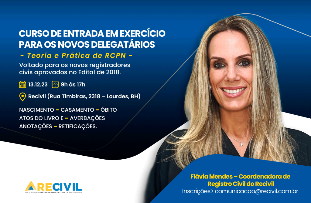 A programação começa às 9h e segue até às 17h, com intervalo para almoço e coffee break. O curso será ministrado pela Coordenadora Jurídica do Registro Civil do Recivil e professora da pós-graduação em Direito Notaria e Registral da PUC Minas, Flávia Mendes, e irá abordar temas como registro de nascimento, casamento e óbito, atos do Livro E, averbações, anotações e retificações.