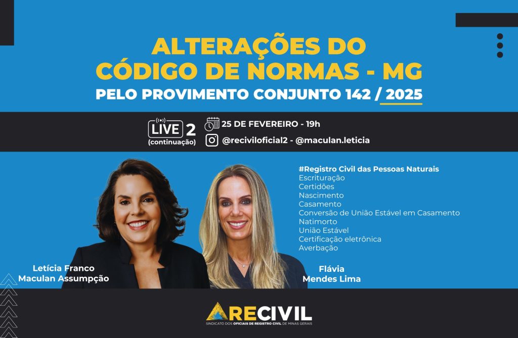 Com o sucesso da live sobre as alterações do Código de Normas de Minas Gerais pelo Provimento Conjunto 142/2025, no último dia 17, o Recivil realiza, na próxima terça-feira (25), a segunda parte do encontro on-line pelo Instagram @reciviloficial2, com a participação da diretora do Recivil e oficial do Cartório de Registro Civil e Tabelionato de Notas do Barreiro (BH), Leticia Franco Maculan Assumpção, da coordenadora jurídica de Registro Civil do Recivil, Flávia Mendes Lima, e de oficiais e profissionais de Registro Civil do estado.