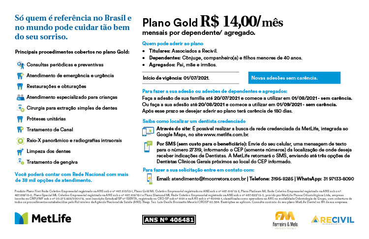 [vc_row][vc_column][vc_column_text]Registradores civis associados ao Recivil que queriam aderir dependentes e agregados ao plano odontológico da MetLife devem preencher formulário com alguns dados cadastrais necessários para a sua implantação. Depois é preciso enviá-los para a corretora parceira do sindicato, Ferreira & Melo Administradora e Corretora de Seguros.