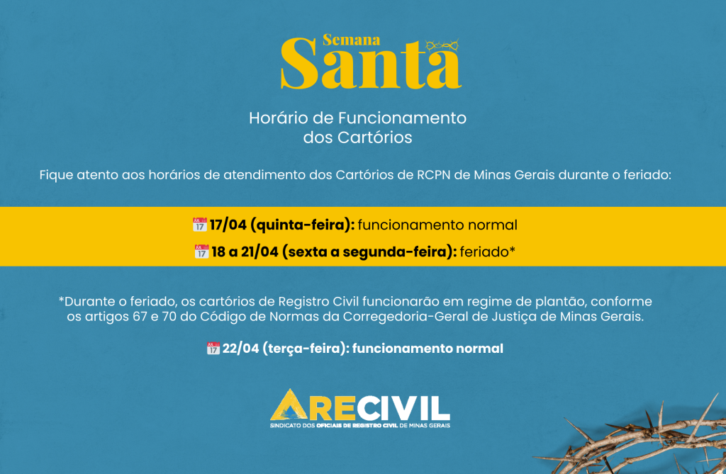*Durante o feriado, os cartórios de Registro Civil funcionarão em regime de plantão, conforme os artigos 67 e 70 do Código de Normas da Corregedoria-Geral de Justiça de Minas Gerais.