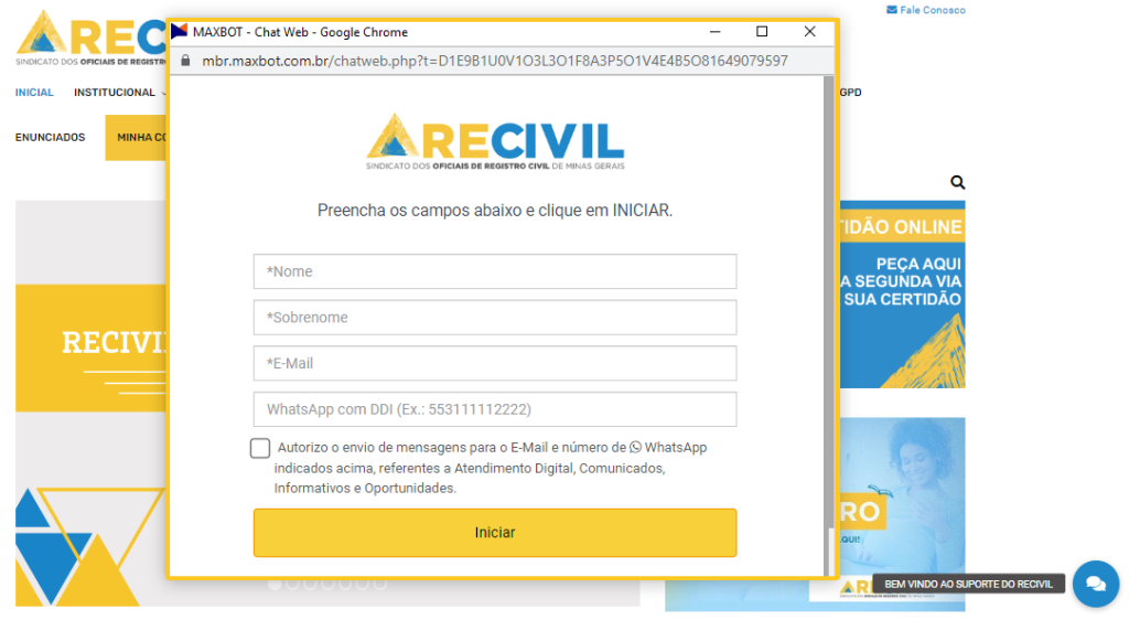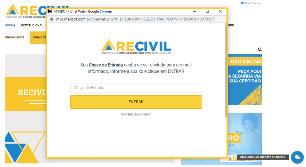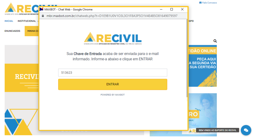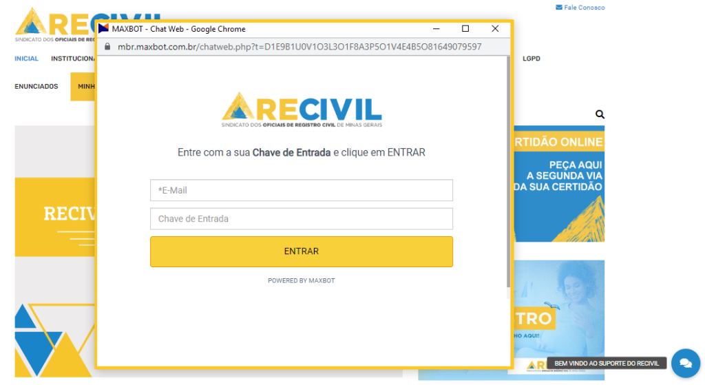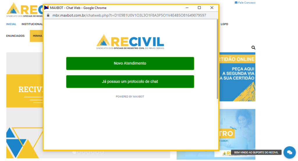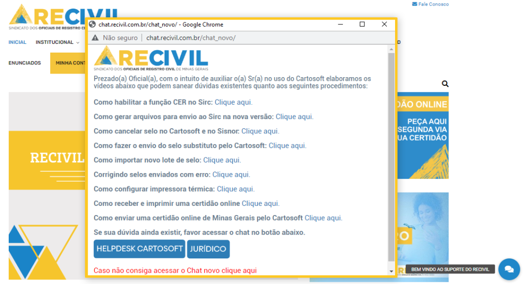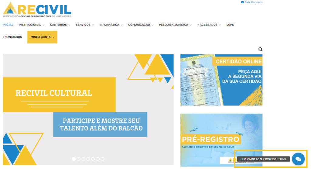 Ao acessar o site do Recivil, clique no ícone de suporte localizado na parte inferior do site, conforme destacado na imagem.
