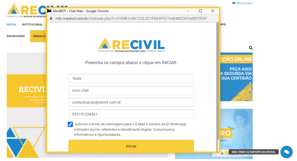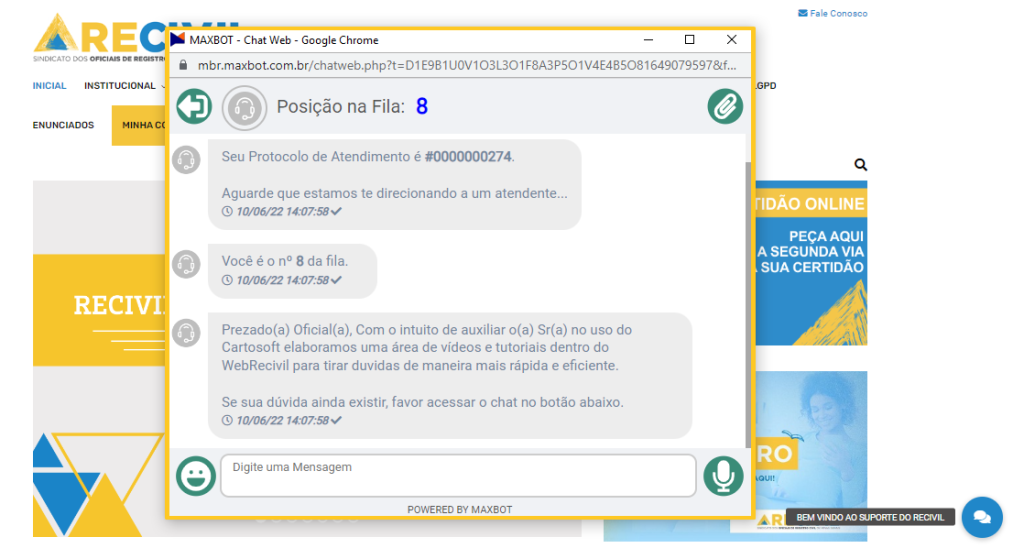 Buscando sempre prestar um atendimento com excelência aos registradores civis, o Departamento de Tecnologia da Informação do Recivil apresenta mais uma novidade. Agora os oficiais poderão se comunicar com o Recivil através de um chat mais moderno, visando aprimorar a experiência nos atendimentos oferecidos e atendendo as diretrizes da Lei Geral de Proteção de Dados (LGPD).