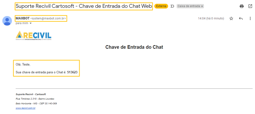 A chave de acesso será recebida por e-mail conforme exemplo abaixo.